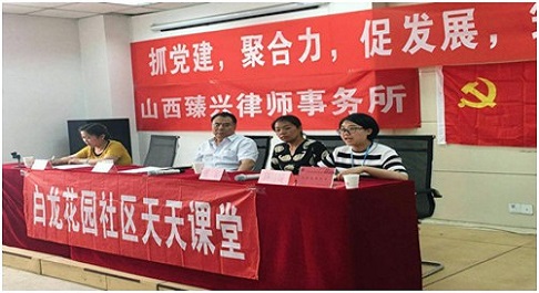 2018年6月29日下午,为庆祝党成立九十七周年,“抓党建、聚合力、促发展、筑和谐”主题活动由白龙花园社区与山西臻兴律师事务所共同组织。宣传会议由社区张洁主任主持,山西运政印刷厂领导、党员代表、山西臻兴律师事务所路靖媛律师、社区居民代表参加。