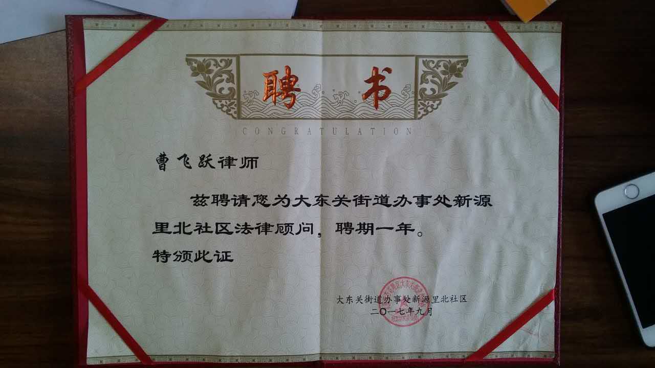 热烈庆祝曹飞跃律师被聘为大东关街道办事处新源里北社区法律顾问、路靖媛律师被聘为大东关街道办事处白龙花园社区法律顾问 ......